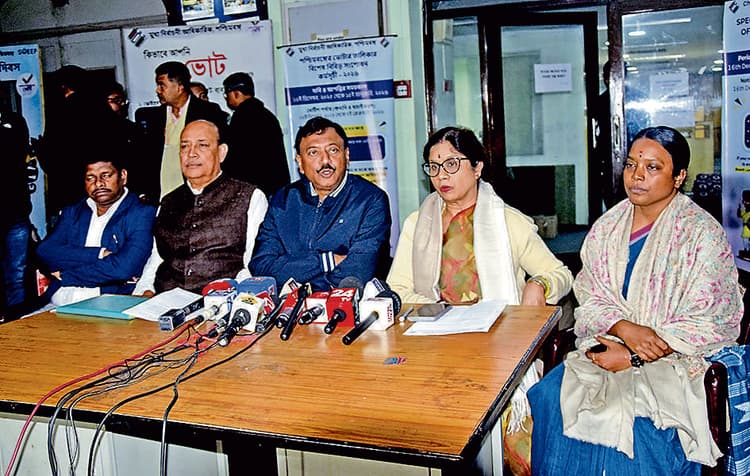 कोलकाता. एक बार फिर तृणमूल कांग्रेस के पांच सदस्यीय प्रतिनिधि दल मंगलवार शाम को सीईओ कार्यालय पहुंचा और यहां उन्होंने उपचुनाव आयुक्त ज्ञानेश भारती से मुलाकात कर ज्ञापन सौंपा. मालूम रहे कि ज्ञानेश भारती मंगलवार को ही कोलकाता पहुंचे हैं. दल में सांसद पार्थ भौमिक, मंत्री शशि पांजा, पुलक राय सहित अन्य शामिल थे. बैठक के बाद संवाददाता सम्मेलन में तृणमूल नेताओं ने उपचुनाव आयुक्त से बीएलए को भी सुनवाई केंद्र के अंदर जाने देने, उम्रदराज लोगों को सुनवाई केंद्र पर नहीं बुलाकर उनके घर जाकर सुनवाई करने सहित कई मांगें रखीं. सांसद पार्थ भौमिक ने कहा कि बुजुर्गों को भारी परेशानी हो रही है. सुनवाई के लिए लोग एंबुलेंस से जा रहे हैं. यह तुरंत बंद होना चाहिए. एसआइआर के नाम पर लोग परेशान हो रहे हैं.
