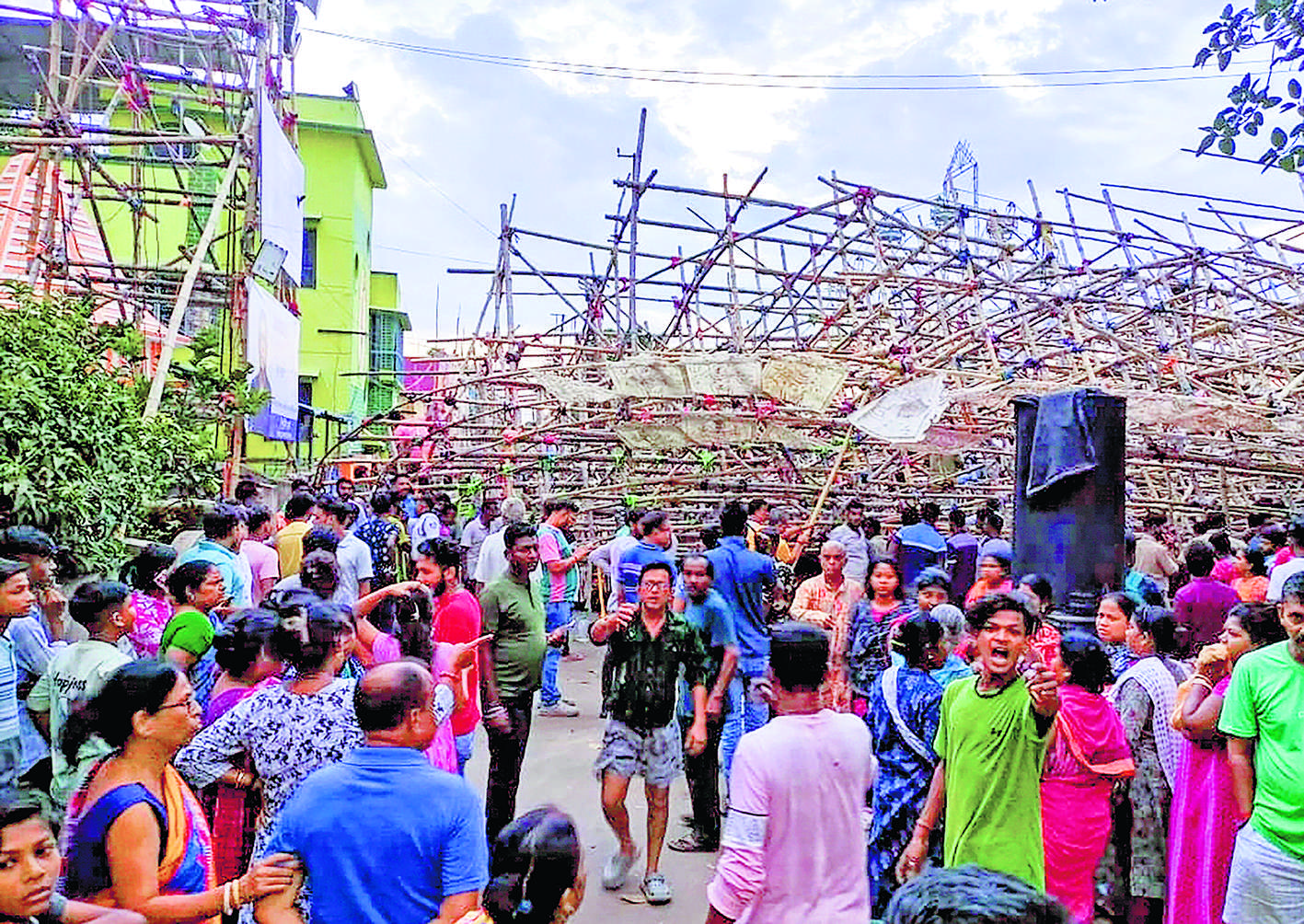 चंदननगर में मंगलवार की शाम अचानक आये बवंडर से चारों तरफ अफरा-तफरी मच गयी. तेज हवा के झोंकों और हल्की बारिश के बीच कन्हैयालाल पल्ली का लगभग 75 फीट ऊंचा जगद्धात्री पूजा पंडाल अचानक ढह गया. इस हादसे में 14 लोग घायल हो गये. इनमें एक की हालत गंभीर है. गंभीर रूप से घायल व्यक्ति को कोलकाता रेफर किया गया है, जबकि अन्य जख्मी लोगों का इलाज चंदननगर सब-डिविजनल अस्पताल में चल रहा है.