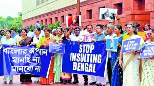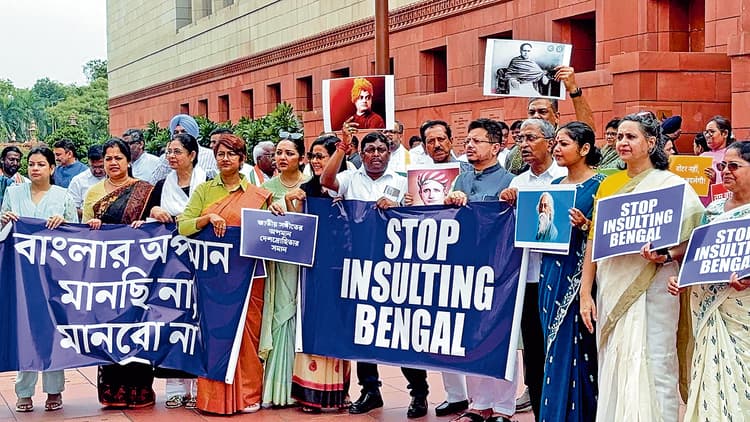 नयी दिल्ली, कोलकाता. नयी दिल्ली में तृणमूल कांग्रेस के सांसदों ने संसद परिसर में प्रधानमंत्री नरेंद्र मोदी नीत भाजपा सरकार के खिलाफ नारेबाजी की. उन्होंने हाथ में बैनर लेकर विरोध प्रदर्शन किया. बैनर पर लिखा था कि ‘स्टॉप इंसल्टिंग बंगाल’ यानी बंगाल का अपमान बंद करो. हाल ही में दिल्ली पुलिस द्वारा साझा किये गये एक पत्र में कथित तौर पर बांग्ला भाषा को ‘बांग्लादेशी भाषा’ कहे जाने पर तृणमूल ने इसकी जमकर आलोचना की थी. मुख्यमंत्री ममता बनर्जी ने भी दिल्ली पुलिस और केंद्र सरकार पर तीखा हमला बोला था. उन्होंने आरोप लगाया था कि गृह मंत्रालय के अधीन काम करनेवाली दिल्ली पुलिस ने बांग्ला भाषा को “बांग्लादेशी भाषा” कहकर न सिर्फ बंगालियों का अपमान किया है, बल्कि संविधान का भी उल्लंघन किया है.