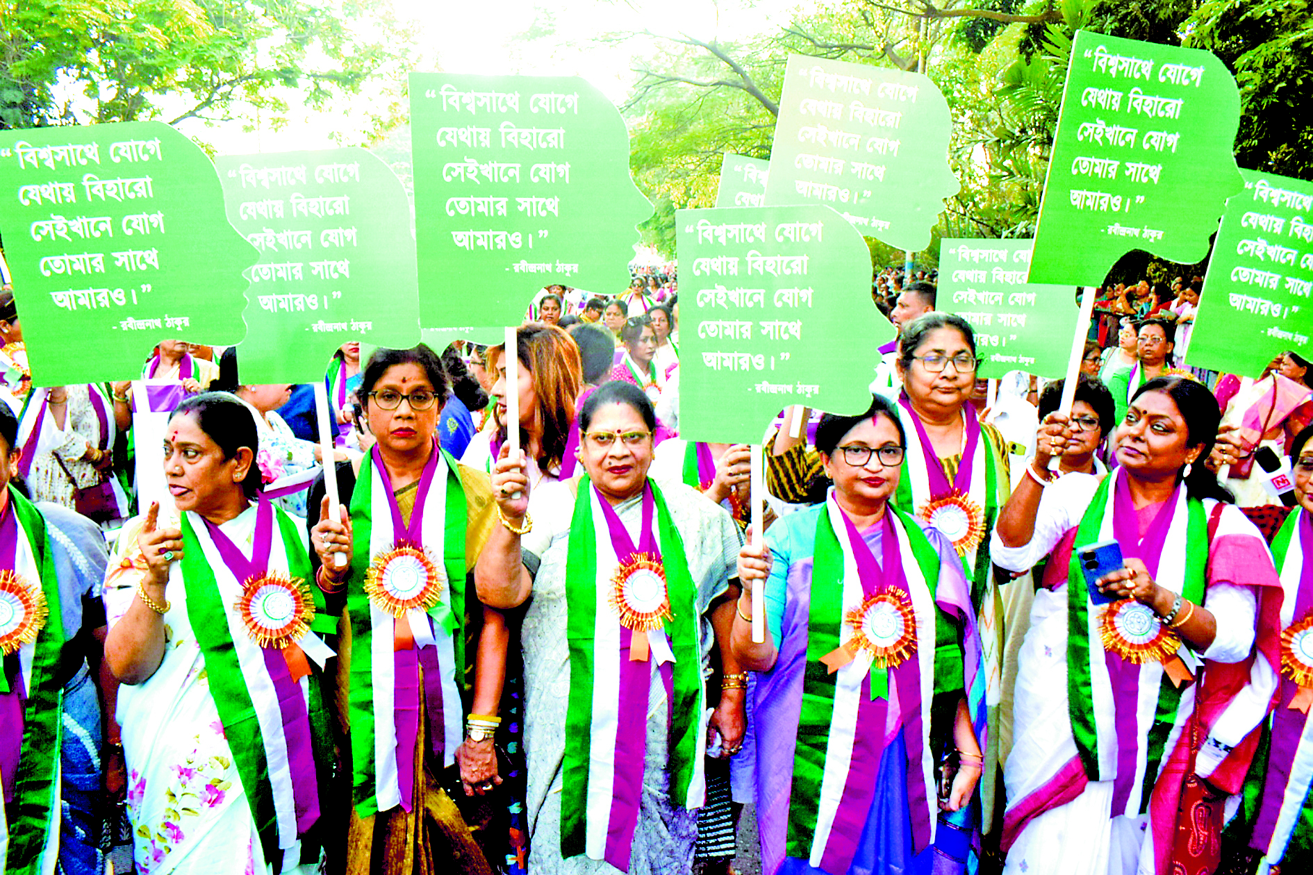 कोलकाता. अंतरराष्ट्रीय महिला दिवस के मौके पर शनिवार को तृणमूल महिला कांग्रेस की ओर से महानगर में ””””””””दीदी बांग्लार घरे-घरे”””””””” (बंगाल के हर घर में दीदी) रैली निकाली गयी, जबकि राज्य के अन्य स्थानों पर भी कार्यक्रम आयोजित किये गये. उच्च माध्यमिक की परीक्षा होने के कारण रैली में माइक का प्रयोग नहीं करते हुए तृणमूल महिला कांग्रेस की रैली महानगर के रवींद्र सदन से शुरू हुई, जो अलग-अलग मार्गों से गुजरती हुई डोरिना क्रॉसिंग के पास समाप्त हुई. रैली में तृणमूल महिला कांग्रेस की अध्यक्ष चंद्रिमा भट्टाचार्य के अलावा माला राय व अन्य महिला नेता भी शामिल हुईं. मंत्री चंद्रिमा भट्टाचार्य ने कहा कि मुख्यमंत्री ममता बनर्जी के नेतृत्व में महिलाओं के सशक्तीकरण का काम जारी है. राज्य में कई विकास योजनाएं चल रही हैं, जिनकी सराहना अंतरराष्ट्रीय पटल पर भी हो चुकी है. यही वजह कि इस बार अंतरराष्ट्रीय महिला दिवस के उपलक्ष्य में निकाली गयी रैली की थीम ‘दीदी बांग्लार घरे-घरे”” रखी गयी है. तृणमूल महिला कांग्रेस राज्य में महिलाओं के लिए राज्य सरकार द्वारा किये कार्यों का प्रचार जारी रखेगी.