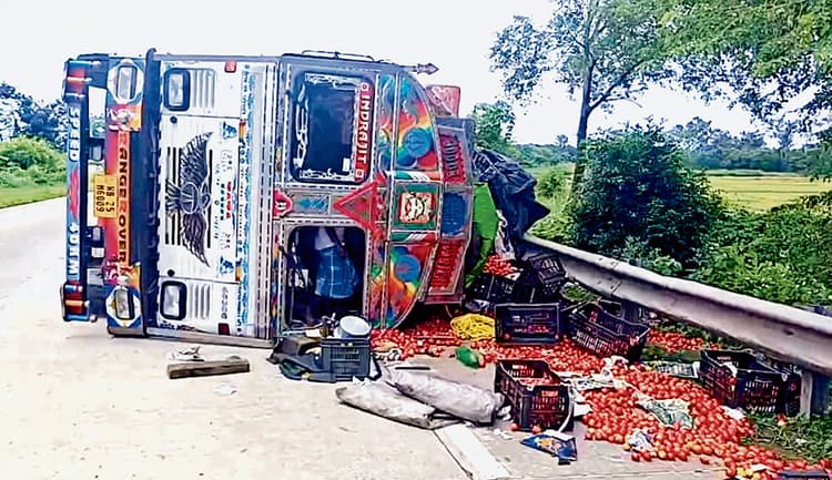 खड़गपुर. पश्चिम मेदिनीपुर जिले के नारायणगढ़ थाना क्षेत्र के मकरामपुर इलाके में खड़गपुर-बालासोर मुख्य सड़क पर गुरुवार को टमाटर लदा एक ट्रक अनियंत्रित होकर पलट गया. इस हादसे में तीन लोग घायल हो गये. यह ट्रक बेंगलुरु से खड़गपुर होते हुए सिउड़ी जा रहा था. जानकारी के मुताबिक, ट्रक के आगे चल रही एक गाड़ी अचानक रुक गयी, जिससे ट्रक चालक का संतुलन बिगड़ गया. चालक ने तुरंत ब्रेक लगाया, लेकिन ट्रक अनियंत्रित होकर पलट गया. हादसे में घायल हुए लोगों को स्थानीय लोगों ने अस्पताल पहुंचाया. दुर्घटना के कारण इलाके में कुछ देर के लिए यातायात बाधित हो गया. सूचना मिलने पर पुलिस मौके पर पहुंची और स्थिति को सामान्य किया. पुलिस इस घटना की जांच कर रही है.