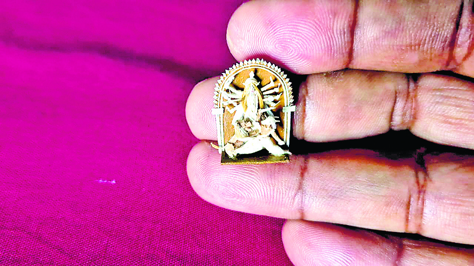 संवाददाता, बैरकपुर.उत्तर 24 परगना के पलता स्थित शांतिनगर निवासी एवं इंडियन आर्ट कॉलेज के पूर्व छात्र देवप्रसाद मालाकार ने इस बार दुर्गा पूजा से पहले एक अनोखी कलाकृति प्रस्तुत की है. उन्होंने गन्ने के रेशे से मात्र दो सेंटीमीटर ऊंची दुर्गा प्रतिमा तैयार की है, जो इलाके में लोगों के बीच आकर्षण का केंद्र बनी हुई है. देवप्रसाद मालाकार हर साल सबसे छोटी दुर्गा प्रतिमा बनाने के लिए जाने जाते हैं.इस वर्ष उन्होंने गन्ने का रस निकालने के बाद बचे हुए रेशे का उपयोग कर सात दिनों की मेहनत से यह अनूठी प्रतिमा तैयार की. उन्होंने बताया, “साल 2000 से अब तक मैं अलग-अलग माध्यमों जैसे मिट्टी, माचिस की तिल्ली, कच्चू के पत्ते, भूसा, चाक और जूट से छोटी-छोटी दुर्गा प्रतिमाएं बनाता रहा हूं. इस बार गन्ने के रेशे का प्रयोग किया है.” उनकी बनायी प्रतिमा देखने के लिए स्थानीय लोग बड़ी संख्या में पहुंच रहे हैं. कला के प्रति समर्पित देवप्रसाद का कहना है कि उनका प्रयास आगे भी जारी रहेगा और वह अपनी रचनात्मकता से लोगों का ध्यान आकर्षित करते रहेंगे.