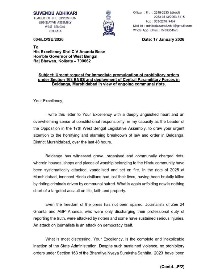 शमशेरगंज और मुर्शिदाबाद में हुए दंगों के दौरान सेंट्रल फोर्स की तैनाती के लिए कलकत्ता हाई कोर्ट के आदेश का जिक्र करते हुए शुभेंदु अधिकारी ने राज्यपाल को लिखे पत्र में कहा- यह आदेश किसी खास घटना या तारीख तक सीमित नहीं है. यह बेलडांगा में चल रही हिंसा पर भी लागू होता है. इससे पहले 2025 में, मुर्शिदाबाद में वक्फ प्रदर्शनों के नाम पर बड़े पैमाने पर आगजनी की घटना घटी थी. शमशेरगंज में हरगोबिंद दास और उनके बेटे चंदन दास को उनके घर से घसीटकर बाहर निकाला गया और बेरहमी से उनकी हत्या कर दी गई थी. शुभेंदु अधिकारी ने लिखा- मैं एनआईए द्वारा तुरंत जांच की मांग करता हूं. यह मुर्शिदाबाद में सीएए विरोधी और वक्फ विरोधी प्रदर्शनों के दौरान भड़की से भयावह हिंसा है.