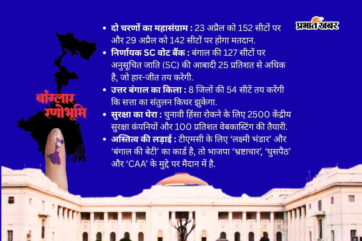 West Bengal Assembly Election 2026: पश्चिम बंगाल विधानसभा चुनाव 2026 के लिए वोटिंग 23 और 29 अप्रैल को दो चरणों में होगी. 4 मई को नतीजे आ जायेंगे. जानें बंगाल विधानसभा की 294 सीटों का गणित, SC/ST वोट बैंक का प्रभाव, मुख्य उम्मीदवार और TMC-BJP के बीच अस्तित्व की लड़ाई के बड़े मुद्दे.