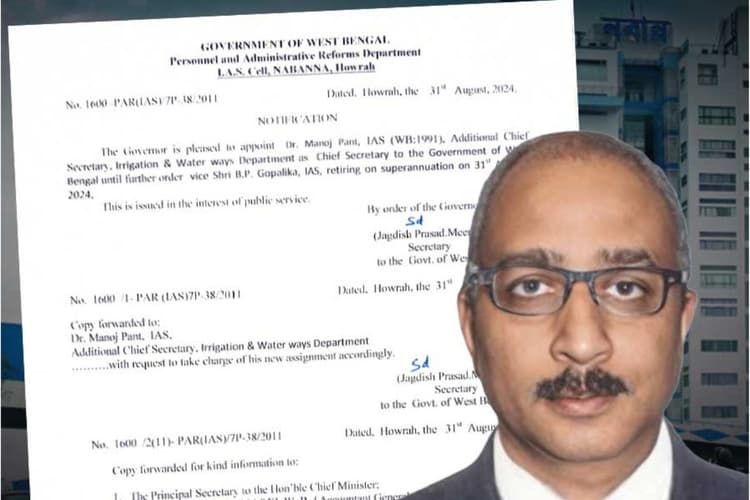 West Bengal : राज्य के नए मुख्य सचिव मनोज पंत बनाये गये हैं. शनिवार को नबान्न द्वारा जारी अधिसूचना के जरिए मनोज पंत के नाम की घोषणा की गई है. आज से उन्होंने पदभार भी संभाल लिया है. गौरतलब है कि मुख्य सचिव बीपी गोपालिका का तीन महीनों का एक्सटेंशन आज पूरा हो गया था. राज्य सरकार ने केंद्र से और तीन महीने का एक्सटेंशन मांगा था लेकिन केन्द्र की ओर से मंजूरी नहीं मिली. मंजूरी नहीं मिलने के बाद मुख्यमंत्री ममता बनर्जी ने मनोज पंत को नया मुख्य सचिव चुना है.