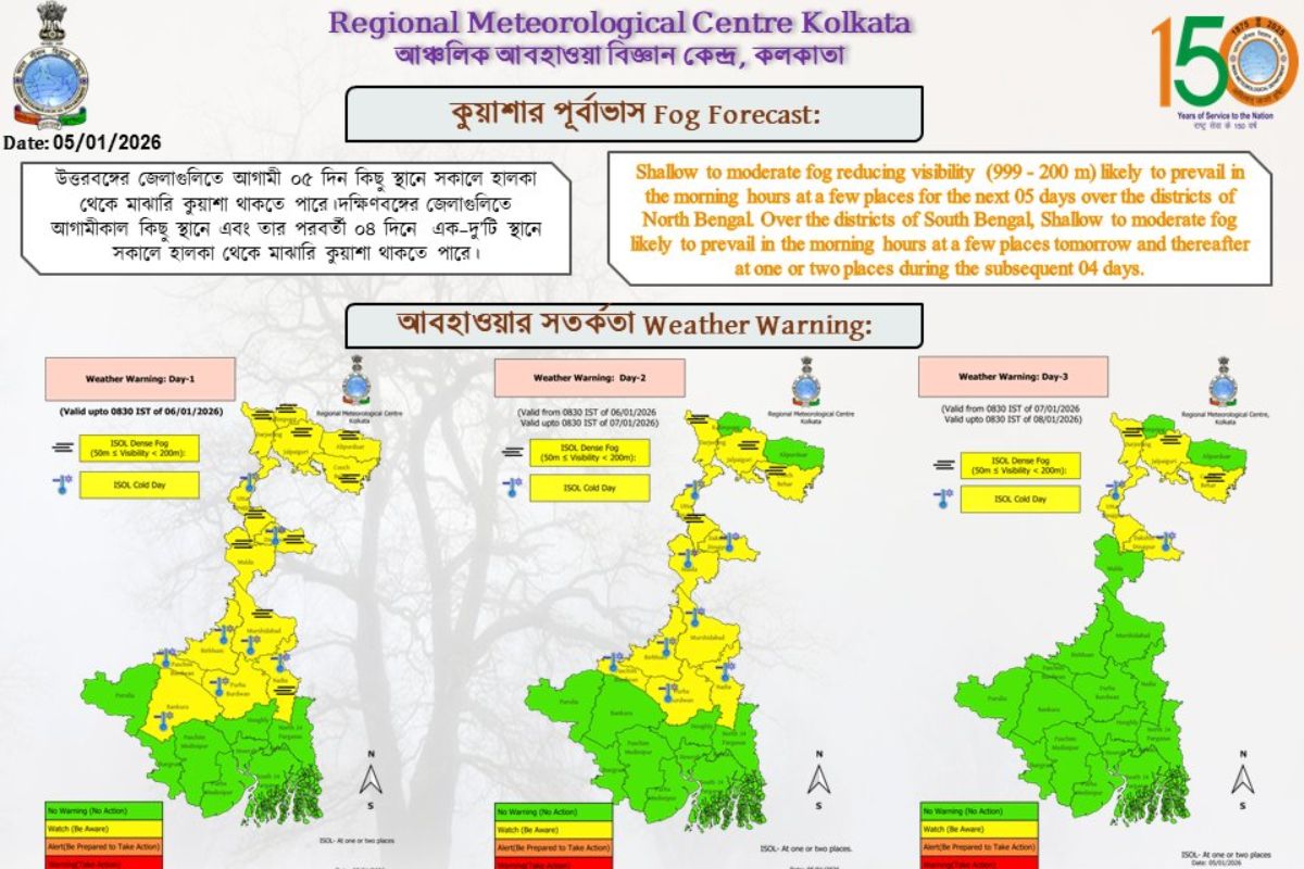मौसम विभाग ने उत्तर बंगाल के सभी जिलों के लिए घने कोहरे की चेतावनी जारी की गयी है. मौसम विभाग ने कहा कि अगले 3 दिनों में दक्षिण बंगाल में तापमान में 2 से 3 डिग्री की गिरावट आने की संभावना है. अगले 5 दिनों तक दक्षिण बंगाल में तापमान सामान्य से 2 से 4 डिग्री कम रहने की उम्मीद है.