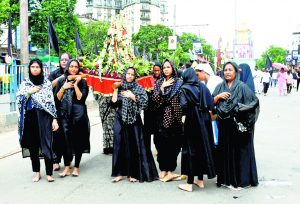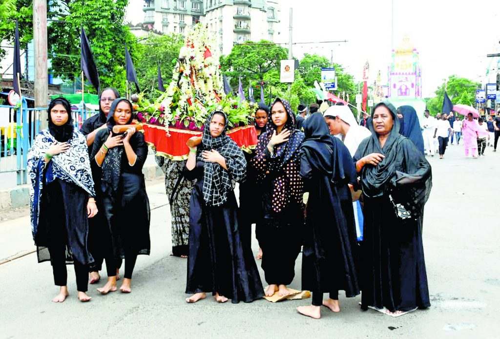 कोलकाता. टॉलीगंज में कंधों पर ताजिया लेकर मातमी जुलूस में शामिल हुईं महिलाएं. कहीं मुहर्रम के मातमी जुलूस में शामिल युवाओं ने दिखाये करतब, तो कहीं जुलूस में हजारों की भीड़ देखी गयी. ढोल-नगाड़ों की मातमी धुन पर लोगों की आंखें गमगीन थीं.