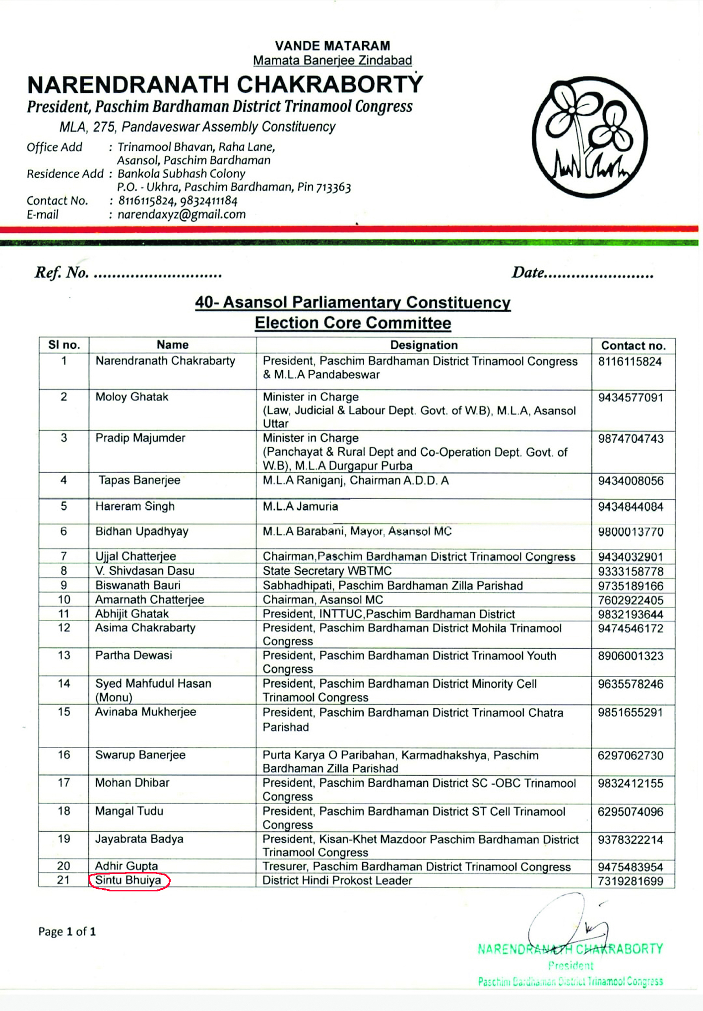 आसनसोल लोकसभा सीट के लिए चुनाव कोर कमेटी की नई सूची में जिलाध्यक्ष नरेंद्रनाथ चक्रवर्ती, राज्य के श्रम, विधि व न्यायमंत्री मलय घटक, पंचायत व ग्रामीण विकास मंत्री प्रदीप मजूमदार, रानीगंज के विधायक तापस बनर्जी, जामुड़िया के विधायक हरेराम सिंह, बाराबनी के विधायक विधान उपाध्याय, जिला तृणमूल के चेयरमैन उज्ज्वल चटर्जी, राज्य कमेटी के सचिव वी.शिवदासन दासू, पश्चिम बर्दवान जिला परिषद के सभाधिपति विश्वनाथ बाउरी, आसनसोल नगर निगम के चेयरमैन अमरनाथ चटर्जी, महिला तृणमूल की जिलाध्यक्ष असीमा चक्रवर्ती, आइएनटीटीयूसी के जिलाध्यक्ष अभिजीत घटक, युवा तृणमूल के जिलाध्यक्ष पार्थ देवासी, अल्पसंख्यक सेल के जिलाध्यक्ष सैयद महफूदुल हसन, तृणमूल छात्र परिषद के जिलाध्यक्ष अविनव मुखर्जी, जिला परिषद के कर्माध्यक्ष स्वरूप बनर्जी, एससी-ओबीसी सेल के जिला अध्यक्ष मोहन धीबर, एसटी सेल के जिलाध्यक्ष मंगल टुडू, किसान खेत मजदूर संगठन के जिलाध्यक्ष जयब्रत वैद्य, तृणमूल जिला कमेटी के कोषाध्यक्ष अधीर गुप्ता और तृणमूल हिंदी प्रकोष्ठ के जिलाध्यक्ष सिंटू भुइयां का नाम शामिल है.