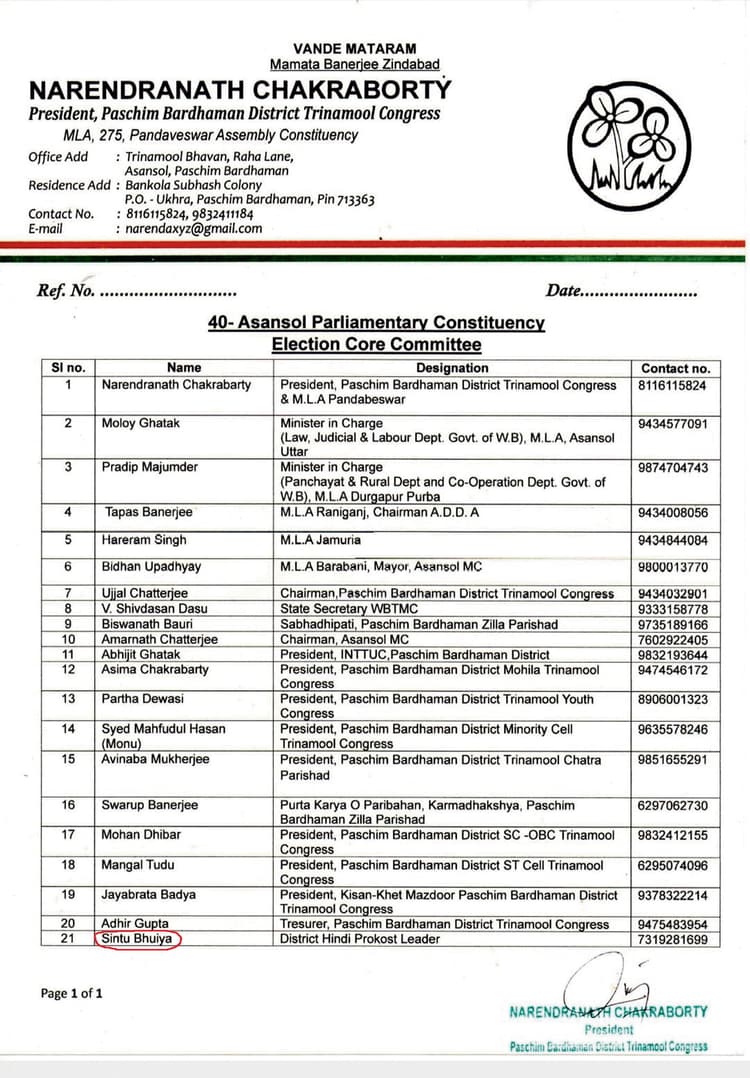 आसनसोल लोकसभा सीट के लिए चुनाव कोर कमेटी की नई सूची में जिलाध्यक्ष नरेंद्रनाथ चक्रवर्ती, राज्य के श्रम, विधि व न्यायमंत्री मलय घटक, पंचायत व ग्रामीण विकास मंत्री प्रदीप मजूमदार, रानीगंज के विधायक तापस बनर्जी, जामुड़िया के विधायक हरेराम सिंह, बाराबनी के विधायक विधान उपाध्याय, जिला तृणमूल के चेयरमैन उज्ज्वल चटर्जी, राज्य कमेटी के सचिव वी.शिवदासन दासू, पश्चिम बर्दवान जिला परिषद के सभाधिपति विश्वनाथ बाउरी, आसनसोल नगर निगम के चेयरमैन अमरनाथ चटर्जी, महिला तृणमूल की जिलाध्यक्ष असीमा चक्रवर्ती, आइएनटीटीयूसी के जिलाध्यक्ष अभिजीत घटक, युवा तृणमूल के जिलाध्यक्ष पार्थ देवासी, अल्पसंख्यक सेल के जिलाध्यक्ष सैयद महफूदुल हसन, तृणमूल छात्र परिषद के जिलाध्यक्ष अविनव मुखर्जी, जिला परिषद के कर्माध्यक्ष स्वरूप बनर्जी, एससी-ओबीसी सेल के जिला अध्यक्ष मोहन धीबर, एसटी सेल के जिलाध्यक्ष मंगल टुडू, किसान खेत मजदूर संगठन के जिलाध्यक्ष जयब्रत वैद्य, तृणमूल जिला कमेटी के कोषाध्यक्ष अधीर गुप्ता और तृणमूल हिंदी प्रकोष्ठ के जिलाध्यक्ष सिंटू भुइयां का नाम शामिल है.