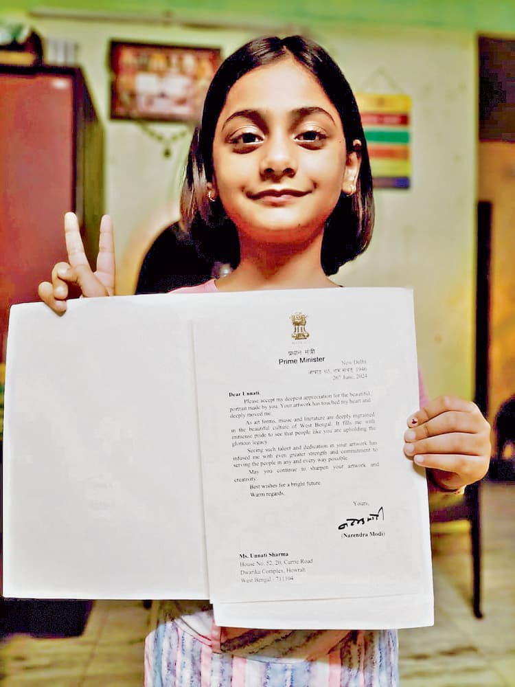 हावड़ा. लोकसभा चुनाव के पहले 12 मई को सांकराइल में आयोजित प्रधानमंत्री नरेंद्र मोदी की सभा में दो बहनें, वाणी और उन्नति शर्मा पहुंची थीं. उन्नति ने अपने हाथों से पीएम मोदी की तस्वीर बनाकर लायी थी, जिसे पीएम मोदी ने ले लिया था. तीन महीने बाद उन्नति की मेहनत रंग लायी. पीएम मोदी ने उन्नति की पेंटिंग की तारीफ करते हुए उसे प्रशस्तिपत्र भेजा है. यह पत्र मिलते ही उन्नति के साथ परिवार के लोग बेहद खुश हैं. मालूम रहे कि प्रधानमंत्री का भाषण चलने के दौरान कैरी रोड की रहने वाली उन्नति, अपनी बहन वाणी शर्मा के साथ सभा में गयी थी. दोनों बहनें ‘बेटी बचाओ, बेटी पढ़ाओ’ और पीएम की तस्वीर (पेंसिल स्केच) हाथों में लेकर लहरा रही थीं. जब पीएम की नजर उन पर पड़ी, तो उन्होंने अपना भाषण बीच में ही रोक दिया और मंच से ही दोनों को आश्वस्त किया कि वह उनकी तस्वीरें जरूर लेंगे. इसके बाद पीएम ने तस्वीरें लाने के लिए अपने प्रतिनिधि को दोनों लड़कियों के पास भेजा. जब प्रतिनिधि उनसे तस्वीरें लेकर जाने लगा, तो दोनों रो पड़ी थीं. यह देख पीएम भी भावुक हो गये थे.