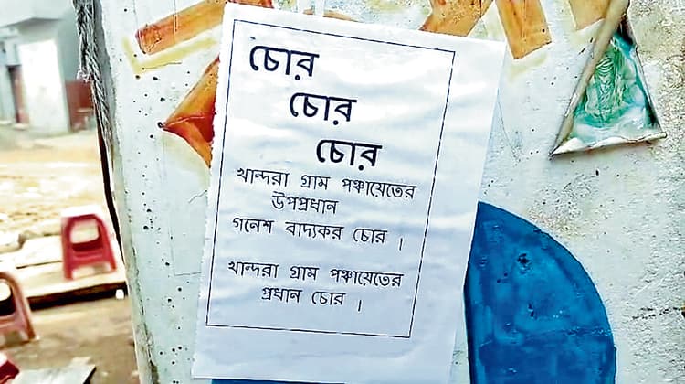 अंडाल. अंडाल ब्लॉक के खांंद्रा गांव में खांद्रा ग्राम पंचायत के प्रधान और उपप्रधान को चोर बताये जाने का पोस्टर पाया गया. रविवार को गांव में जगह-जगह पोस्टर लगा दिखाई दिया. आरोप है कि यह तृणमूल पार्टी के आपसी टकराव का नतीजा है. लेकिन सत्ता पक्ष ने आरोपों से इनकार किया है. कुछ दिन पहले तृणमूल पार्टी के निर्वाचित पंचायत सदस्यों ने भ्रष्टाचार और मनमानी करने का आरोप लगाते हुए तृणमूल संचालित खांद्रा ग्राम पंचायत के प्रधान और उप प्रधान के खिलाफ विरोध प्रदर्शन किया था. एक सप्ताह में दो बार पंचायत कार्यालय के गेट पर ताला लटका कर विरोध जताया गया था. उन्होंने प्रमुख व उपप्रमुख से इस्तीफे की भी मांग की. सत्तारूढ़ दल का नेतृत्व, पार्टी के कुछ पंचायत सदस्यों द्वारा प्रमुख और उप प्रमुख के खिलाफ भ्रष्टाचार के आरोपों से असहज था. उस दिन तृणमूल दल के ब्लॉक अध्यक्ष कालोबरन मंडल ने कहा कि मामले की जानकारी जिला अध्यक्ष को दे दी गयी है. शीघ्र बातचीत से समस्या का समाधान निकलेगा. लेकिन रविवार को दोबारा पोस्टर पाये जाने से यह साबित हो गया कि विवाद अभी तक सुलझा नहीं है. रविवार की सुबह, निवासियों ने खांद्रा बस स्टैंड बटशिबतला और अन्य स्थानों पर सफेद कागज पर काली स्याही से लिखे पोस्टर देखे, लेकिन पोस्टर के नीचे प्रेषक का नाम नहीं लिखा होने के कारण भ्रम की स्थिति पैदा हो गयी. उप प्रधान गणेश बाद्यकर ने कहा कि जो काम करते हैं उनकी आलोचना होती है. हम काम कर रहे हैं इसलिए हमारी आलोचना हो रही है. उन्होंने कहा कि अगर भ्रष्टाचार के आरोप साबित हो गये तो वह इस्तीफा दे देंगे. गणेश बाद्यकर ने संकेत दिया कि पोस्टर मामले में पार्टी का ही कोई शामिल हो सकता है. दूसरी ओर पार्टी के भीतर गणेश बाद्यकर के विरोधी माने जाने वाले आशीष भट्टाचार्य ने कहा कि उन्हें प्रधान और उपप्रधान से शिकायत जरुर है. लेकिन पोस्टर मामले में उनका कोई हाथ नहीं है. उन्होंने आरोप लगाया कि विपक्षी ने पार्टी के अंदर कलह बढ़ते देख ऐसा किया होगा ताकि हम आपस में लड़ें. साथ ही उन्होंने कहा कि जिनके खिलाफ पोस्टर है, वे थाने में एफआइआर दर्ज करायें.