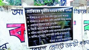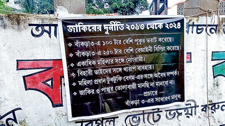 उन्होंने कहा कि विपक्षी दलों की यह करतूत है. जानकारी के अनुसार, सोमवार सुबह बांकड़ा के प्यादा पाड़ा, सरदार पाड़ा, मोल्ला पाड़ा सहित अन्य इलाकों में तृणमूल नेता के खिलाफ कई सारे पोस्टर लगाये जाने पर तृणमूल कार्यकर्ताओं के बीच खलबली मच गयी. मौके पर पहुंचे तृणमूल कार्यकर्ताओं ने तुरंत पोस्टर को खोल दिया. पोस्टर में लिखा गया है कि जाकिर हुसैन ने 100 तालाबों को पाटा है और 250 से अधिक अवैध निर्माण किये हैं. तृणमूल नेता पर जबरन वसूली करने की बात पोस्टर पर लिखी गयी है. इस घटना के बारे में पूछे जाने पर भाजपा के प्रदेश सचिव उमेश राय ने कहा कि यह पोस्टर किसी राजनीतिक दल ने नहीं लगाया है. स्थानीय लोगों ने पोस्टर लगाकर अपने गुस्से का इजहार किया है.