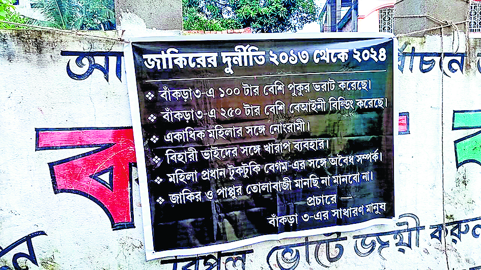 डोमजूर विधानसभा अंतर्गत बांकड़ा-3 नंबर ग्राम पंचायत के कई इलाकों में तृणमूल नेता व पंचायत सदस्य जाकिर हुसैन के खिलाफ पोस्टर लगाये गये हैं.