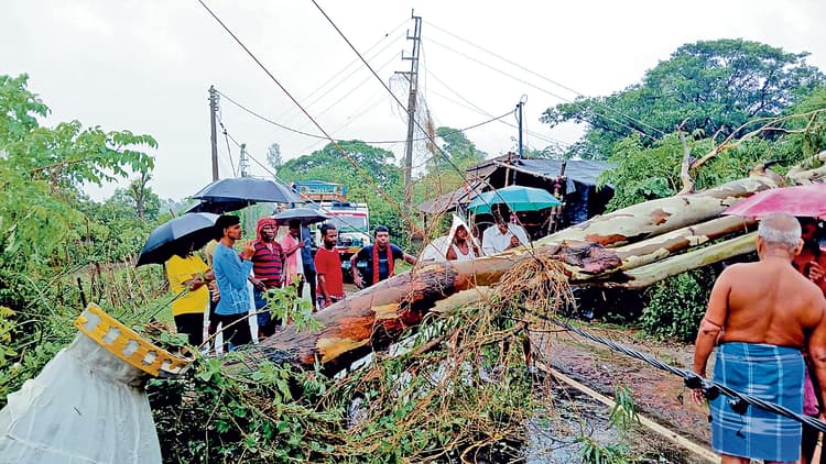 उत्तर 24 परगना के संदेशखाली इलाके में भी रेमाल का असर दिखा. कई जगहों पर पेड़ और बिजली पोल गिर गये. टंगतला में नदी का बांध भी धंस गया. हासनाबाद के दो नंबर लेबूखाली रोड पर कई पेड़ गिर गये. स्वरूपकाठी बाजार, आमबेड़िया, बांकड़ा बाजार में कई बिजली पोल उखड़ गये. 11 हजार वोल्ट का पोस्ट भी गिर गया, जिसे इलाके में बिजली गुल हो गयी है. स्वरूपकाठी के पास एक बड़ा पेड़ गिरने से एक घर क्षतिग्रस्त हो गया है. जब डीएमजी की टीम पेड़ को हटाने की कोशिश कर रही थे, तभी एक कर्मी करंट की चपेट में आ गया. उसका इलाज चल रहा है. दो बिजली पोल भी गिर गये थे. लेबुखाली रोड पर भी पेड़ गिरने से ट्रैफिक प्रभावित रहा. संदेशखाली दो नंबर ब्लॉक के अतापुर इलाके में रायमंगल नदी खतरे के निशान से ऊपर बह रही है. इससे इलाके के लोगों में दहशत है. लोगों ने राहत शिविरों में शरण ले ली है. वहीं, दक्षिण हिंगलगंज अवैतनिक प्राथमिक विद्यालय में अस्थायी राहत शिविर खोला गया है. वहीं, दत्तपुकुर थाना अंतर्गत काशिमपुर में एक पेड़ और बिजली पोल गिरने से रास्ता बंद हो गया. पालपाड़ा में 35 नंबर राष्ट्रीय राजमार्ग पर एक पेड़ गिरने से मार्ग अवरुद्ध हो गया. घंटों बाद पेड़ हटाया गया. नतून रास्ता पर एक पेड़ पेट्रोल पंप पर गिर गया, जिससे वहां खड़े दो वाहन क्षतिग्रस्त हो गये.