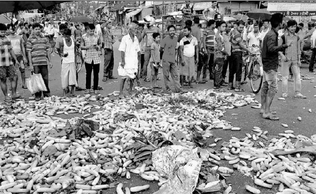 जलपाईगुड़ी : खीरे का उचित मूल्य नहीं मिलने के विरोध में किसानों ने सड़क पर अपनी उपज फेंक कर विरोध जताया. रविवार को किसान धूपगुड़ी रेगुलेटेड मार्केट में खीरा बेचने पहुंचे थे, लेकिन उचित दाम नहीं मिलने से क्षुब्ध हो उठे. पहले उन्होंने मार्केट मोड़ पर राष्ट्रीय राजमार्ग को जाम किया. बाद में किसान वहां से शहर के मुख्य चौराहे पर आ गये और राष्ट्रीय राजमार्ग को जाम कर दिया.