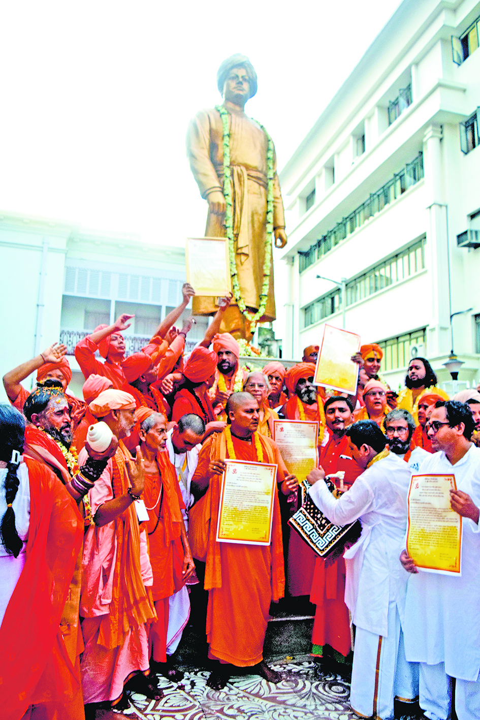 साधु-संतों ने निकाली स्वाभिमान यात्रा, हजारों हुए शामिल कोलकाता. नंगे पांव भगवा वस्रधारी हजारों साधु-संतों ने कोलकाता की सड़कों पर उतर कर सत्ताधारी पार्टी द्वारा किये जा रहे हमले और अभद्र भाषा का प्रयोग करने के खिलाफ अपने विरोध का इजहार किया. बंगीय संन्यासी समाज के आह्वान पर मायेर बाड़ी (शारदा मां के घर) बागबाजार से निकला यह जुलूस स्वामी विवेकानंद के जन्म स्थान तक गया, जहां साधु- संतों ने स्वामी विवेकानंद की प्रतिमा के नीचे एकत्रित होकर अपने विरोध का इजहार किया. उनके साथ बड़ी संख्या में कोलकाता के आम लोग भी शामिल थे. रैली में शामिल कार्तिक महाराज ने पत्रकारों से कहा कि आज धर्म संकट में है, इसलिए साधु-संतों को राजपथ पर उतरना पड़ा है. जिस तरह से हजारों लोग सड़कों पर उतर कर उनलोगों का समर्थन कर रहे हैं, उससे उनका हौसला बढ़ा है. धर्म की रक्षा के लिए लोग आगे आ रहे हैं. पूर्णदास बाउल ने कहा कि आज जो दौर है, उसमें हिंदुओं को लगातार दबाया जा रहा है. सनातन धर्म के प्रचार-प्रसार में बाधा आ रही है. इससे हमलोगों की आत्मा दुखी है. धर्म बचाने के लिए सभी लोगों को आगे आना ही होगा. इस दौरान साधु-संतों ने बताया कि हाल ही में एक चुनावी सभा को संबोधित करते हुए मुख्यमंत्री ममता बनर्जी ने भारत सेवाश्रम के संत कार्तिक महाराज पर अशोभनीय टिप्पणी की थी. इसे लेकर राजनीतिक हलकों में चर्चा शुरू हो गयी. साधु-संतों का अपमान होते देख खुद कार्तिक महाराज भी मैदान में आये. उन्होंने मुख्यमंत्री से माफी मांगने की मांग करते हुए उन्हें चेतावनी दी कि अगर वह ऐसा नहीं करती हैं, तो उनके खिलाफ कानूनी कार्रवाई करने को वह बाध्य होंगे. स्थिति को देखते हुए बंगीय साधु समाज की ओर से संत स्वाभिमान यात्रा का एलान किया गया था, जिसमें खुद कार्तिक महाराज, पूर्णचंद्र बाउल समेत अन्य साधु-संत शामिल हुए. बागबाजार से शुरू हुई संत स्वाभिमान यात्रा श्यामबाजार पांच माथा मोड होते हुए शिमला स्ट्रीट तक पहुंची. इस यात्रा को अपना समर्थन देने के लिए सड़कों के दोनों किनारे बड़ी संख्या में आम लोग खड़े थे, जो जय श्रीराम के नारे लगा रहे थे. यह स्वाभिमान यात्रा केवल कोलकाता में ही नहीं हुई, बल्कि राज्य के विभिन्न इलाकों में भी निकाली गयी, जिसमें शामिल लोगाें ने मुख्यमंत्री ममता बनर्जी द्वारा की गयी अमर्यादित टिप्पणी का विरोध किया. लोगों ने एकजुट होकर मुख्यमंत्री से साधु समाज से माफी मांगने की मांग की.