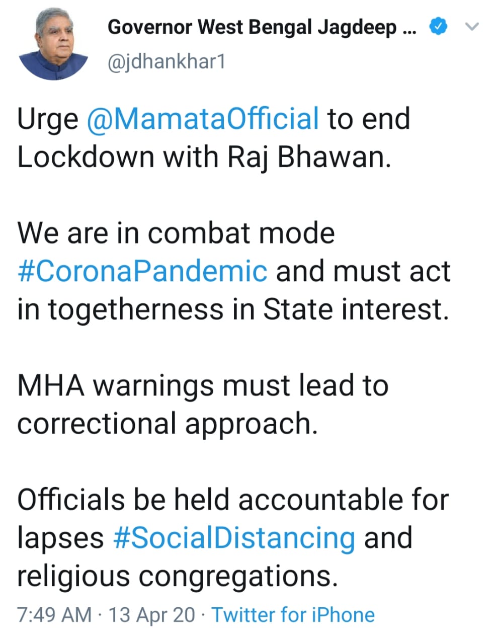 अपने ट्वीट में राज्यपाल ने लिखा, “मैं ममता बनर्जी से राजभवन के साथ लॉक डाउन को समाप्त करने का आग्रह करता हूं. राज्य के हित में कोरोनावायरस से मुकाबले के लिए एक साथ मिलकर काम करने की जरूरत है. केंद्रीय गृह मंत्रालय ने राज्य सरकार को जो चेतावनियां दी है उस पर सुधारात्मक दृष्टिकोण अपनाना चाहिए. अधिकारियों की भी जिम्मेवारी तय होनी चाहिए और सामाजिक तथा मजहबी कार्यक्रमों को इजाजत दिए जाने को लेकर जवाब तलब करने की जरूरत है.”