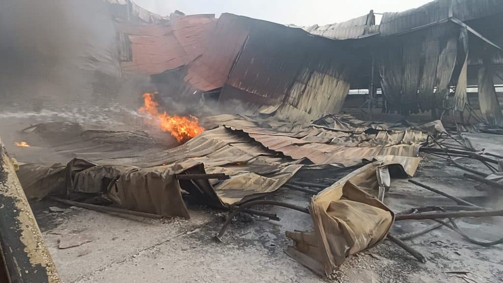 आग लगने की वजह से खराब हो गए गोदाम के शेड