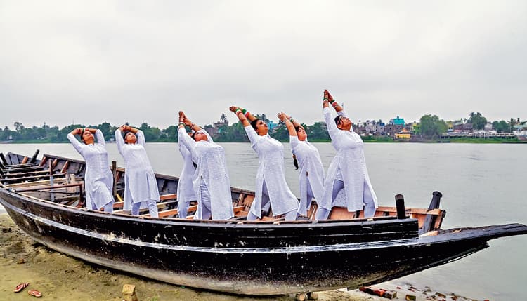 अंतरराष्ट्रीय योग दिवस पर हुगली नदी के किनारे महिलाओं ने नौका पर योग किया.