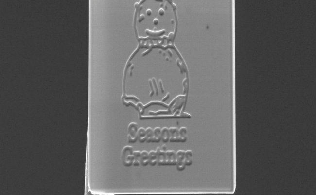 इसे देखने के लिए एक शक्तिशाली सूक्ष्मदर्शी (माइक्रोस्कोप) की जरूरत पड़ेगी. इस पर त्योहारी मौसम से जुड़ा संदेश अंकित है. ब्रिटेन के राष्ट्रीय भौतिकी प्रयोगशाला (एनपीएल) के अनुसंधानकर्ताओं द्वारा बनाये गये कार्ड में हिम मानव नजर आ रहा है.
