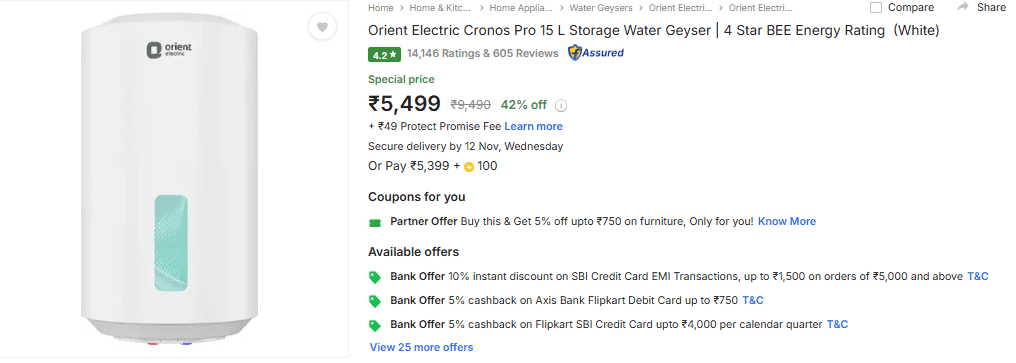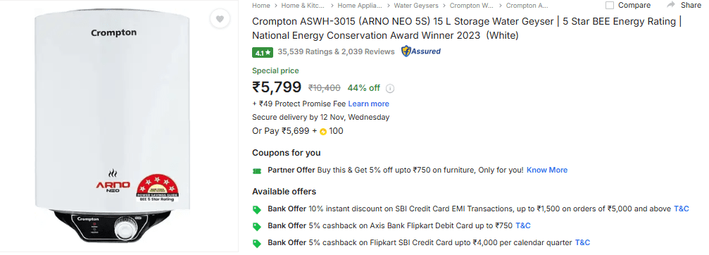फ्लिपकार्ट पर Crompton के 15 लीटर वाले Arno Neo 5S मॉडल पर 44% तक की छुट मिल रही है. जिससे इस गीजर की कीमत 10,400 रुपये से कम होकर 5,799 रुपये हो गई है. Crompton का Arno Neo 5S एक स्टोरेज वाटर गीजर है, जिसमें आपको 30 से 80 डिग्री तक का टेंपरेचर रेंज मिलेगा. इसमें आपको पॉलीमर और कोपर हीटिंग एलिमेंट मिलेगा. साथ ही यह 5 स्टार रेटिंग वाला गीजर है. यानी की बिजली की खपत भी कम करेगा. इसके अलावा इसमें कट ऑफ फीचर है, जिससे पानी गर्म होने के बाद अगर गीजर ऑन रहता भी है, तो यह बिजली की खपत नहीं करेगा. साथ ही इसमें एडवांस लेवल सेफ्टी दिया गया है. वहीं, वारंटी कि बात करें तो, इस गीजर के टैंक पर कंपनी 5 साल, हीटिंग एलिमेंट पर 2 साल और प्रोडक्ट पर 2 साल की वारंटी दे रही है.