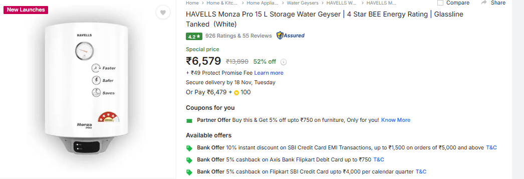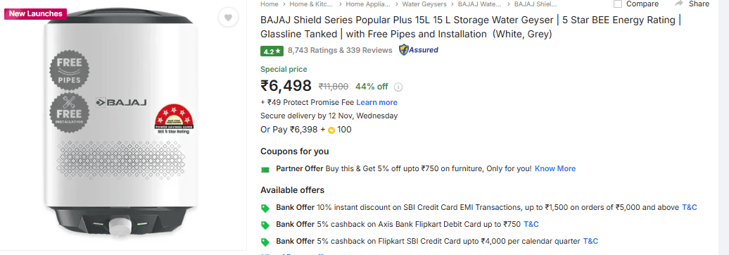 बजाज के 15 लीटर कैपेसिटी वाले स्टोरेज वाटर गीजर पर फ्लिपकार्ट 44% तक की छूट दे रहा है. जिससे इस गीजर की कीमत 11800 रुपये से घटकर 6,498 रुपये हो गई है. यह 5 स्टार रेटिंग के साथ आता है, जिससे बिजली की खपत कम होगी. इस गीजर में 68 से 75 डिग्री तक टेंपरेचर रेंज मिलेगा. इसमें मल्टीपल सेफ्टी सिस्टम दिया गया है. साथ ही यह 2000w पावर कंजम्पशन के साथ आता है. वारंटी कि बात करें तो, कंपनी इस गीजर के टैंक पर 10 साल, हीटिंग एलिमेंट पर 6 साल और प्रोडक्ट पर 4 साल की वारंटी दे रही है.