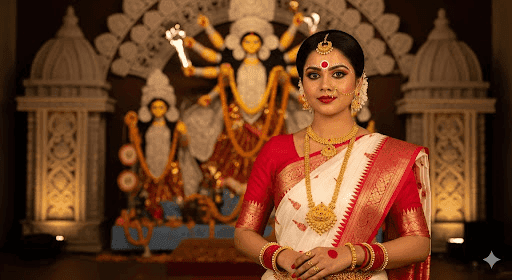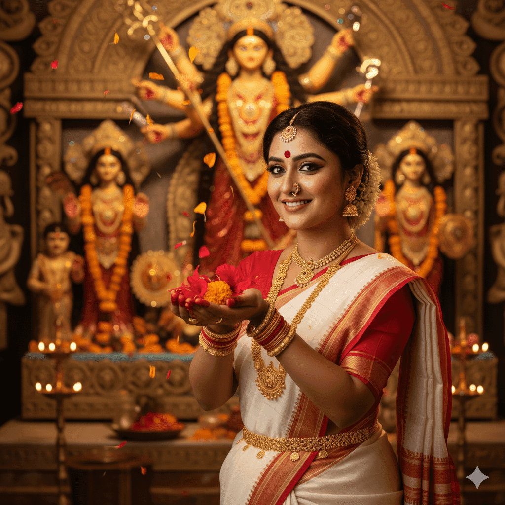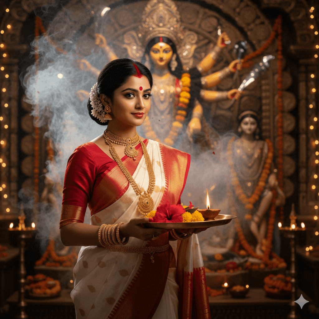 Prompt 2 for Classic Lal-Par Saree Look with Puja Thali: Create a 4K ultra-realistic portrait of a beautiful woman in a traditional red and white Bengali saree (lal-par), large red bindi, gold temple jewelry, holding a puja thali with flowers, standing in front of a grand Durga idol with glowing diyas warm festive lighting.