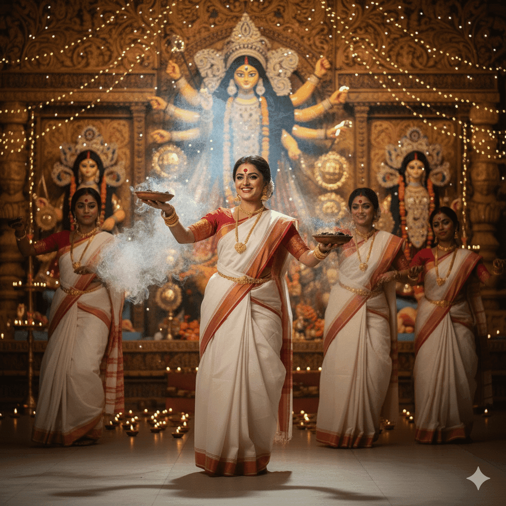 Prompt 3 for Dhunuchi Dance Look: A beautiful Bengali woman wearing a traditional red-bordered white cotton saree draped in authentic Bengali style (aatpoure drape), adorned with ornate gold bangles, large gold earrings, and a big red bindi, smiling gracefully while performing dhunuchi dance. Incense smoke swirls around her in the air, creating a mystical festive atmosphere. Several other Bengali women in similar sarees are also dancing joyfully with dhunuchi in their hands. The background shows a grand Durga Puja pandal decorated with glowing fairy lights, marigold garlands, and a majestic Durga idol, all bathed in warm golden festive lighting — vibrant, energetic, and celebratory mood.”