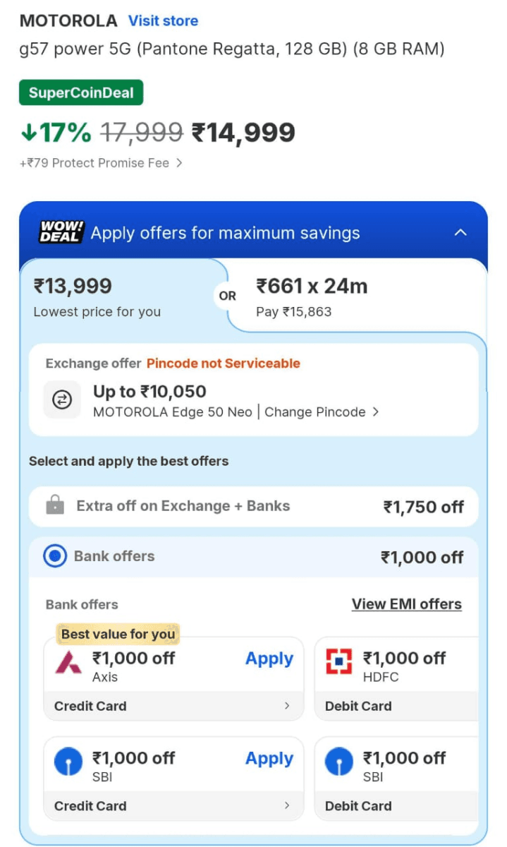 Motorola G57 Power को मोटोरोला ने हाल ही में लॉन्च किया था, जो सिर्फ एक ही वेरिएंट 8GB+128GB ऑप्शन में उपलब्ध है. कीमत कि बात करें, तो मॉडल फ्लिपकार्ट पर 14,999 रुपये में लिस्टेड है. हालांकि, इस मॉडल पर फ्लिपकार्ट AXIS, HDFC और SBI कार्ड पर 1,000 रुपये तक का इंस्टेंट बैंक डिस्काउंट दे रही है, जिससे आप इस मॉडल को 13,999 रुपये में खरीद सकते हैं.