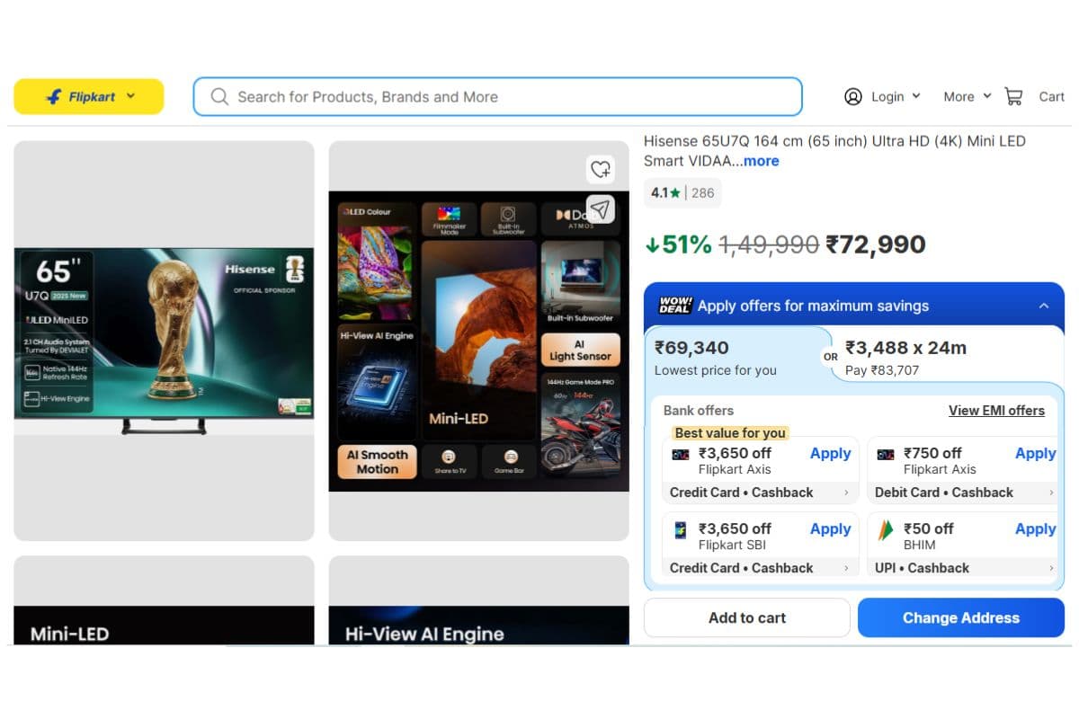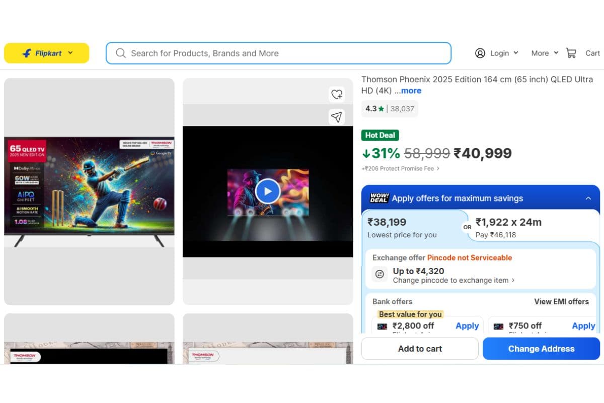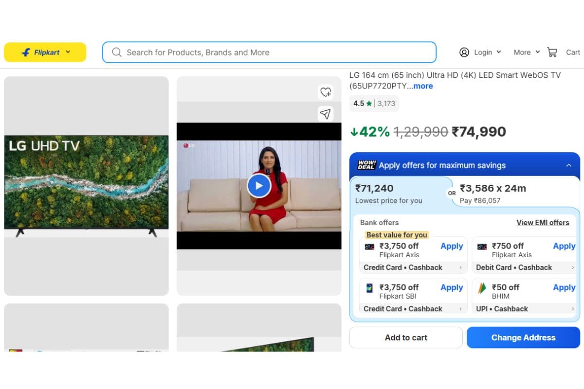 अगर आप लंबे समय से घर के लिए एक बड़ा और बढ़िया स्मार्ट टीवी लेने की सोच रहे हैं, तो आपको ये मौका मिस नहीं करना चाहिए. इस समय 65 इंच का स्मार्ट टीवी काफी सस्ती कीमत में मिल रहा है. यह ऑफर फिलहाल फ्लिपकार्ट पर लाइव है. हमने आपके लिए 65 इंच के कुछ ब्रांडेड टीवी मॉडल्स की लिस्ट तैयार की है, जिन्हें आप जरूर चेकआउट कर सकते हैं. आइए फिर देखते हैं कौन-कौन से हैं ये ऑप्शन.