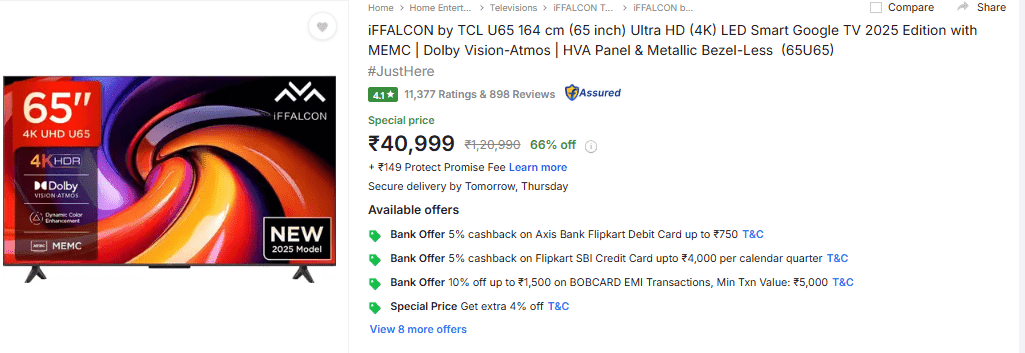iFFALCON 65 inch LED Smart TV पर मिल रहा 66% तक का डिस्काउंट