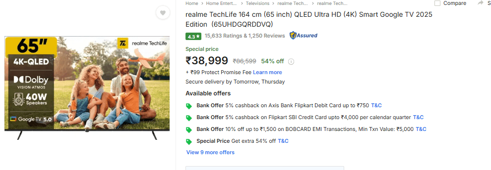Realme 65 inch QLED Smart TV पर मिल रहा 54% तक का डिस्काउंट