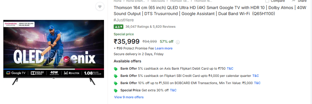 Thomson 65 inch QLED Smart TV पर मिल रहा 57% तक का डिस्काउंट