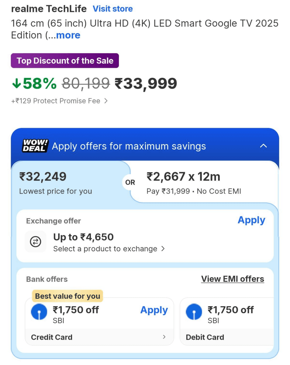 Flipkart Sale में Realme TechLife के 65 इंच Ultra HD LED Smart Google TV पर आपको 58% तक का डिस्काउंट मिलेगा. जिससे आप इस टीवी को 80,199 रुपये की जगह 33,999 रुपये में खरीद सकेंगे. साथ ही अगर आप SBI बैंक कार्ड से पेमेंट करते हैं,तो आपको 1,750 रुपये का इंस्टेंट बैंक डिस्काउंट भी मिलेगा. इतना ही नहीं, अगर आपके पास पहले से कोई पुराना टीवी है, तो उसे एक्सचेंज करने पर आपको करीब 4,650 रुपये तक का एक्सचेंज ऑफर भी मिलेगा. जिससे आप इस टीवी को और भी सस्ते में खरीद सकते हैं. इस मॉडल पर आपको 1 साल तक की वारंटी भी मिलेगी.