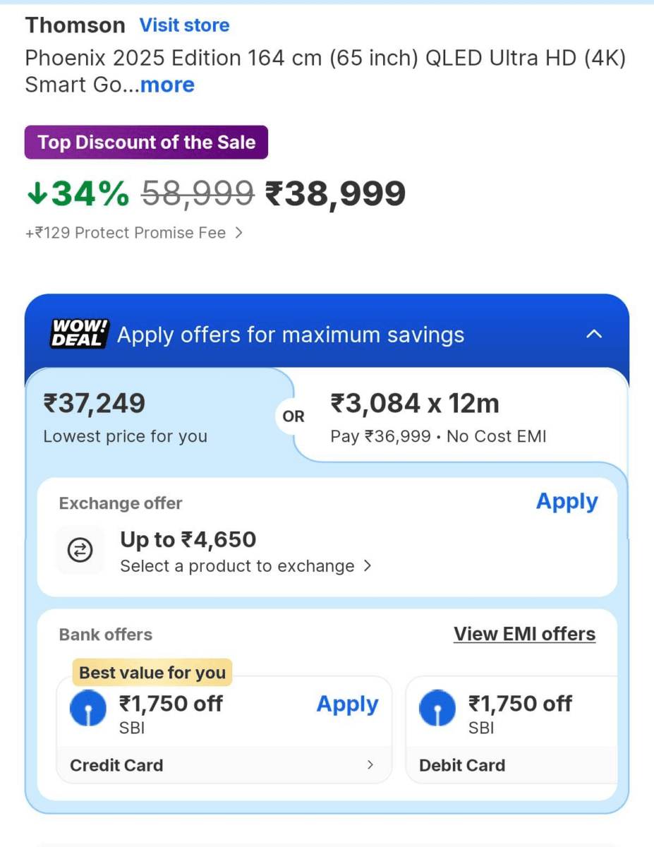 फ्लिपकार्ट Thomson के 65 इंच Ultra HD QLED Smart Google TV पर 34% तक की छूट दे रहा है. जिससे इस स्मार्ट टीवी की कीमत 58,999 रुपये से कम होकर 38,999 रुपये हो गई है. वहीं, इस मॉडल पर भी SBI बैंक कार्ड पर आपको 2,750 रुपये तक का बैंक डिस्काउंट मिलेगा. जिससे आप इस मॉडल को 37,249 रुपये में खरीद सकते हैं. इसके अलावा इस मॉडल पर भी फ्लिपकार्ट एक्सचेंज ऑफर दे रहा है. जिससे आप और भी कम कीमत में इस स्मार्ट टीवी को खरीद सकते हैं.
