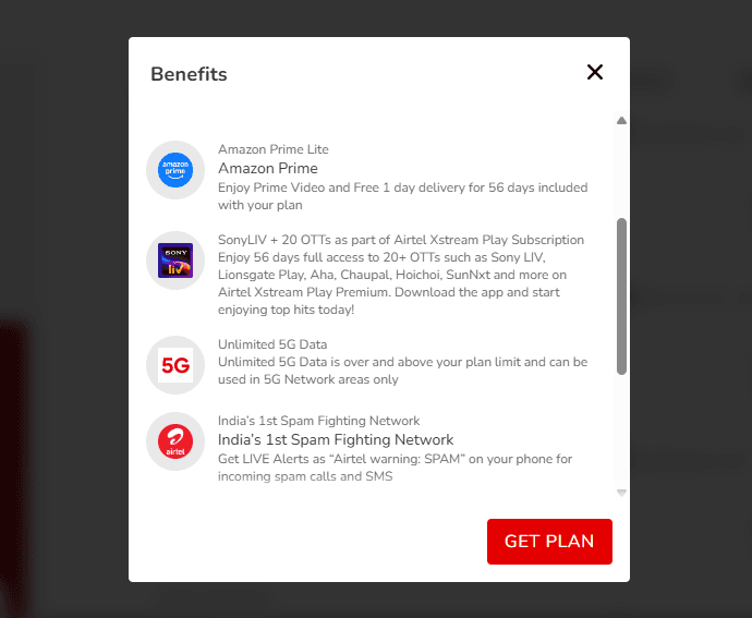 इस प्लान में 56 दिनों के लिए Amazon Prime Lite का सब्सक्रिप्शन फ्री मिल रहा है. इसके अलावा Airtel Xstream Play का सब्सक्रिप्शन भी फ्री मिल रहा है, जिसमें Sony LIV के साथ-साथ Lionsgate Play, Chaupal, Hoichoi, Aha, SunNxt जैसे टोटल 20 OTT प्लेटफॉर्म्स का मजा यूजर्स ले सकेंगे.