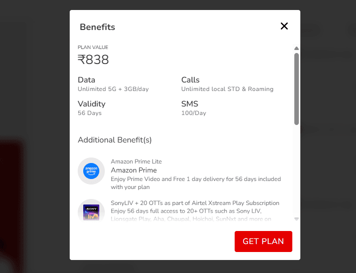 एयरटेल के पोर्टफोलियो में 838 रुपये वाला एक प्लान लिस्टेड है. इस प्लान में कंपनी यूजर्स को 56 दिनों वाला प्लान ऑफर कर रही है. इसमें किसी भी नेटवर्क पर अनलिमिटेड कॉलिंग, डेली 100 फ्री SMS और डेली 3GB डेटा का फायदा मिल रहा है. वहीं, अगर आप 5G यूजर हैं तो आपको अनलिमिटेड डेटा का फायदा मिलेगा.