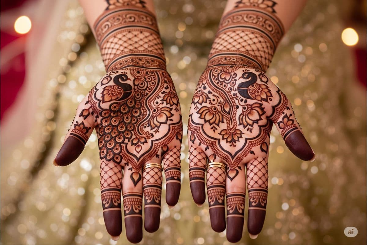 अगर आप चाहती हैं कि तीज पर हाथों में कुछ अलग और खास मेहंदी लगे, तो आप फुल हैंड डिजाइन ट्राई कर सकती है. इसमें हथेली पर मोर और कमल के फूल की आकृति बनाई जाती है. ऐसी डिजाइन आपके हाथों को और भी खूबसूरत बना देगी.