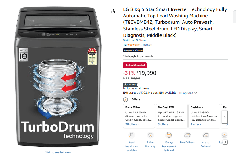 LG की 9Kg फुली ऑटोमैटिक टॉप लोड वॉशिंग मशीन स्मार्ट टेक्नोलॉजी और दमदार परफॉर्मेंस का परफेक्ट कॉम्बिनेशन ऑफर करती है. इसमें दी गई स्मार्ट इन्वर्टर टेक्नोलॉजी लोड के अनुसार बिजली की खपत को कंट्रोल करती है, जिससे एनर्जी सेविंग के साथ बेहतर एफिशिएंसी मिलती है. इस मशीन में TurboDrum टेक्नोलॉजी, Jetspray+ और TurboWash फीचर्स मिलते हैं, जो कम वॉश टाइम में अच्छी क्लीनिंग क्वालिटी ऑफर करते हैं. इसमें यूजर-फ्रेंडली डिजिटल डिस्प्ले वॉश सेटिंग्स और साइकिल प्रोग्रेस को आसानी से कंट्रोल करने का ऑप्शन मिलता है. इस मशीन पर आपको 2 साल की ओवरऑल वारंटी और मोटर पर 10 साल की वारंटी मिलेगी. अमेजन पर इसकी कीमत 19,990 रुपये है.