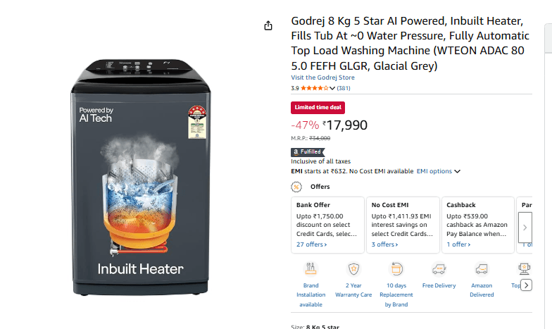 Godrej की यह 8Kg टॉप-लोड वॉशिंग मशीन डेली यूज के लिए अच्छा ऑप्शन है. इसमें Zero Pressure टेक्नोलॉजी मिलेगी, जिससे मशीन लो वॉटर प्रेशर में भी आसानी से काम कर सकती है. मशीन में AI-पावर्ड वॉश प्रोग्राम्स दिए गए हैं, जिससे यह कपड़ों के लोड के हिसाब से अपने-आप पानी के लेवल और वॉश साइकिल के समय को एडजस्ट कर लेते हैं. साथ ही इसमें Acu Wash Drum और इन-बिल्ट हीटर जैसे फीचर्स दिए गए हैं. Godrej की ये वॉशिंग मशीन भी 5 स्टार रेटिंग के साथ आती है, जो बिजली की कम खपत करती है. कीमत कि बात करें, तो अमेजन पर इस मशीन की कीमत 17,990 रुपये है.