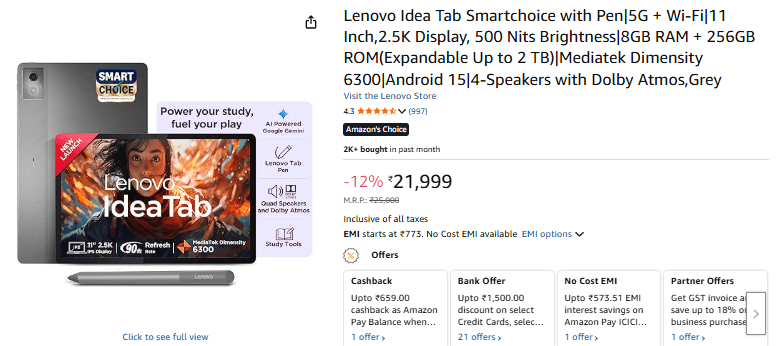 Lenovo का Idea Tab अपनी 2.5K ब्राइट डिस्प्ले और दमदार Dimensity 6300 प्रोसेसर के साथ गेमिंग में अच्छा परफॉर्मेंस देता है. मल्टीप्लेयर और स्ट्रैटेजी गेम्स इसमें स्मूद चलते हैं. 5G सपोर्ट की वजह से ऑनलाइन और क्लाउड गेमिंग में लैग नहीं आता. क्वाड स्पीकर्स गेम्स की आवाज को और बेहतर बनाते हैं, जबकि 256GB स्टोरेज में कई बड़े गेम आराम से स्टोर किए जा सकते हैं. ऑनलाइन गेमिंग के लिए यह एक दमदार एंड्रॉयड टैबलेट है.
