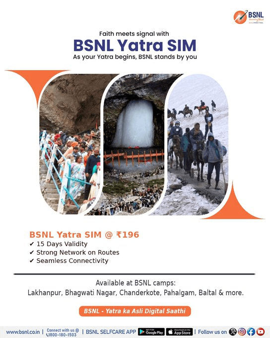 BSNL ने अमरनाथ यात्रियों को दिया तोहफा, मात्र ₹196 में पेश किया यात्रा सिम, जानें खासियत