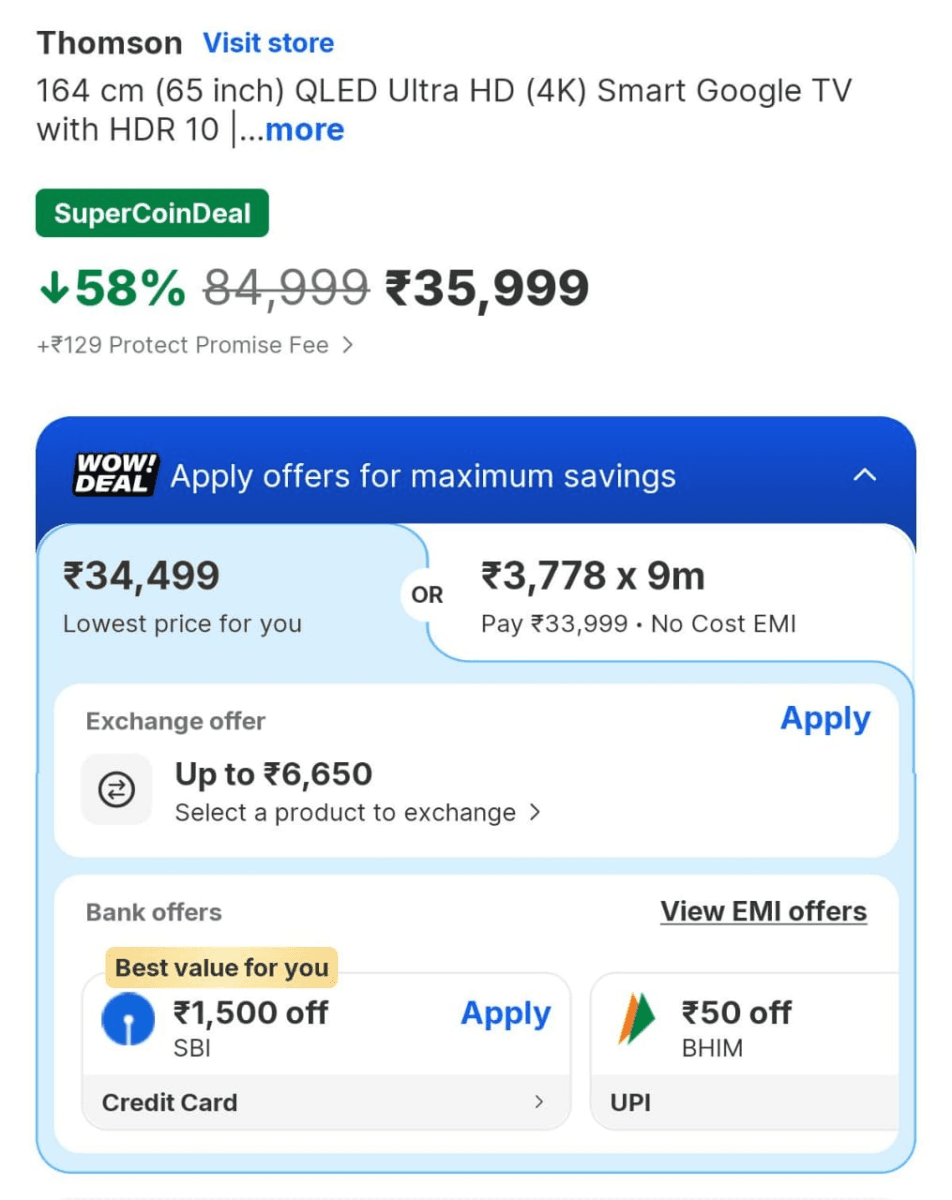 Flipkart Buy Buy Sale में Thomson 65 inch QLED Ultra HD Google TV पर 58% तक की छूट मिल रही है, जिससे इस टीवी की कीमत 84,999 रुपये से घटकर सीधे 35,999 रुपये हो गई है. इतना ही नहीं, इस टीवी पर फ्लिपकार्ट बैंक डिस्काउंट भी दे रहा है. ऐसे में अगर आपके पास SBI क्रेडिट कार्ड है, तो आप 1,500 रुपये तक का बैंक डिस्काउंट पा सकते हैं, जिससे आप इस टीवी को सिर्फ 34,499 रुपये में खरीद सकते हैं.