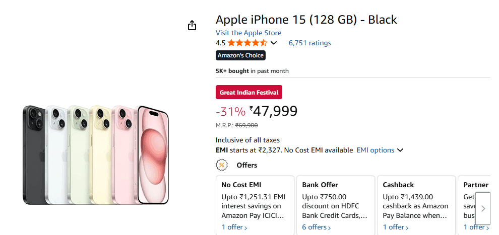 Amazon Great Indian Sale में iPhone 15 पर अच्छा-खासा डिस्काउंट मिल रहा है. iPhone 15 के 128GB वेरिएंट पर 31% तक की छूट मिल रही है. जिससे इस मॉडल की कीमत कम होकर 69,900 रुपये से सीधे 47,999 रुपये हो गई है. वहीं, अगर आपके पास HDFC क्रेडिट कार्ड है तो उस पर आपको 750 रुपये का इंस्टेंट बैंक डिस्काउंट मिलेगा. जिससे आप इस मॉडल को 47,249 रुपये में खरीद सकेंगे. इसके अलावा अगर आप इस मॉडल को EMI पर खरीदना चाहते हैं, तो आप No-Cost EMI पर इसे खरीद सकते हैं.