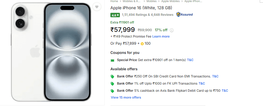 Flipkart Diwali Sale में iPhone 16 पर मिल रहा बैंक डिस्काउंट