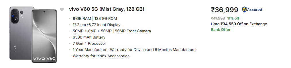 कितने का मिल रहा डिस्काउंट | Discount on Vivo V60 5G