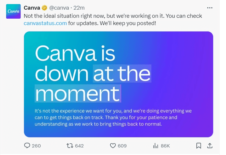 Canva Down: पॉपुलर क्रिएटिव डिजाइन प्लेटफॉर्म Canva कुछ घंटों से डाउन है. जिसकी वजह से करोड़ों यूजर्स परेशान हैं. भारत में सर्वरल यूजर्स की शिकायत है कि उन्हें ऐप पर इमेज डाउनलोड करने, क्रिएट करने में दिक्कत आ रही है. वहीं, कई यूजर्स का कहना है कि उनके सिस्टम में प्लेटफॉर्म या ऐप ही ओपन नहीं हो पा रहा है. होम पेज पर 503 error दिखा रहा है. वहीं, Canva के डाउन होने पर कंपनी ने भी अपने ऑफिशियल एक्स अकाउंट में पोस्ट किया है. जिसमें कंपनी ने लिखा है कि, ‘कंपनी प्लेटफॉर्म में आई दिक्कत को फिक्स करने में जुटी हुई है.’