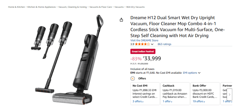 Dreame H12 Vacuum Cleaner एक 4-in-1 कॉर्डलेस फ़्लोर क्लीनर है, जिसे मल्टी-सरफेस के लिए डिज़ाइन किया गया है. ऐसे में यह वैक्यूम कर सकता है, पोंछा लगा सकता है, फ्लोर धो भी सकता है और उसे गर्म हवा से सुखा भी सकता है. यानी कि एक ही गैजेट से सारे काम निपट जाएंगे. इसे 4 स्टार रेटिंग दी गई है. कीमत कि बात करें तो इस गैजेट पर अमेजन सेल में 83% तक का डिस्काउंट मिल रहा है. इसके अलावा HDFC क्रेडिट कार्ड पर 1,750 रुपये का इंस्टेंट बैंक डिस्काउंट भी मिल रहा है. जिससे आप इस गैजेट को 32,249 रुपये में खरीद सकते हैं. इतना ही नहीं, इस प्रोडक्ट को EMI पर भी खरीद सकते हैं. साथ ही इस पर आपको 1 साल की वारंटी भी मिलेगी.