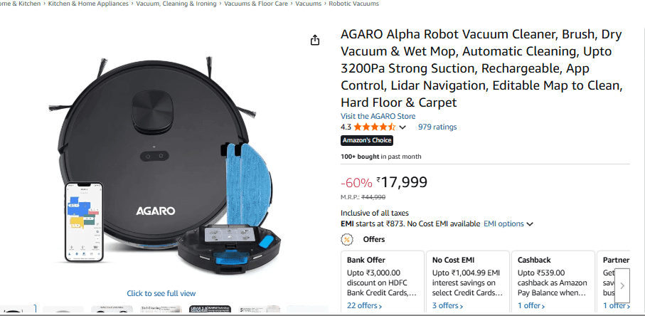 AGARO Alpha Robot Vacuum Cleaner रोबोट वैक्यूम क्लीनर एक 2-इन-1 ऑटोमैटिक क्लीनिंग मशीन है, जो धूल-गंदगी को साफ करने के साथ-साथ फर्श पर मॉप भी कर सकता है. यहां तक कि ये फ्लोर के अनुसार अपनी सक्शन पावर को ऑटोमैटिक एडजस्ट कर सकता है. अमेजन सेल में इस प्रोडक्ट पर 60% तक की छूट मिल रही है. जिसकी इसकी कीमत 17,999 रुपये हो गई है. इस प्रोडक्ट पर HDFC क्रेडिट कार्ड पर 3,800 रुपये का इंस्टेंट बैंक डिस्काउंट भी मिलेगा. जिससे आप इसे 14,199 रुपये में खरीद सकेंगे. इसके अलावा इस प्रोडक्ट को आप EMI पर भी खरीद सकेंगे. साथ ही इस प्रोडक्ट पर आपको 1 साल की वारंटी भी मिलेगी.