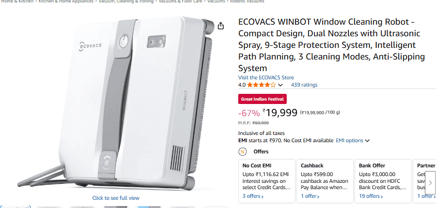 ECOVACS WINBOT Window Cleaning Robot एक कॉम्पैक्ट विंडो क्लीनिंग रोबोट है. इस रोबोट क्लीनर में डुअल नोजल, अल्ट्रासोनिक स्प्रे और इंटेलिजेंट पाथ प्लानिंग जैसे फीचर दिए गए हैं. इस प्रोडक्ट पर अमजेन सेल में 67% तक का डिस्काउंट मिल रहा है. जिससे इस प्रोडक्ट की कीमत 19,999 रुपये हो गई है. इतना ही नहीं, HDFC क्रेडिट कार्ड पर 1,250 रुपये का बैंक डिस्काउंट मिल रहा है. जिससे आप इस प्रोडक्ट को 18,749 रुपये में खरीद सकते हैं. साथ ही इस प्रोडक्ट पर आपको 1 साल तक की वारंटी भी मिलेगी.